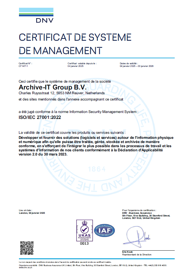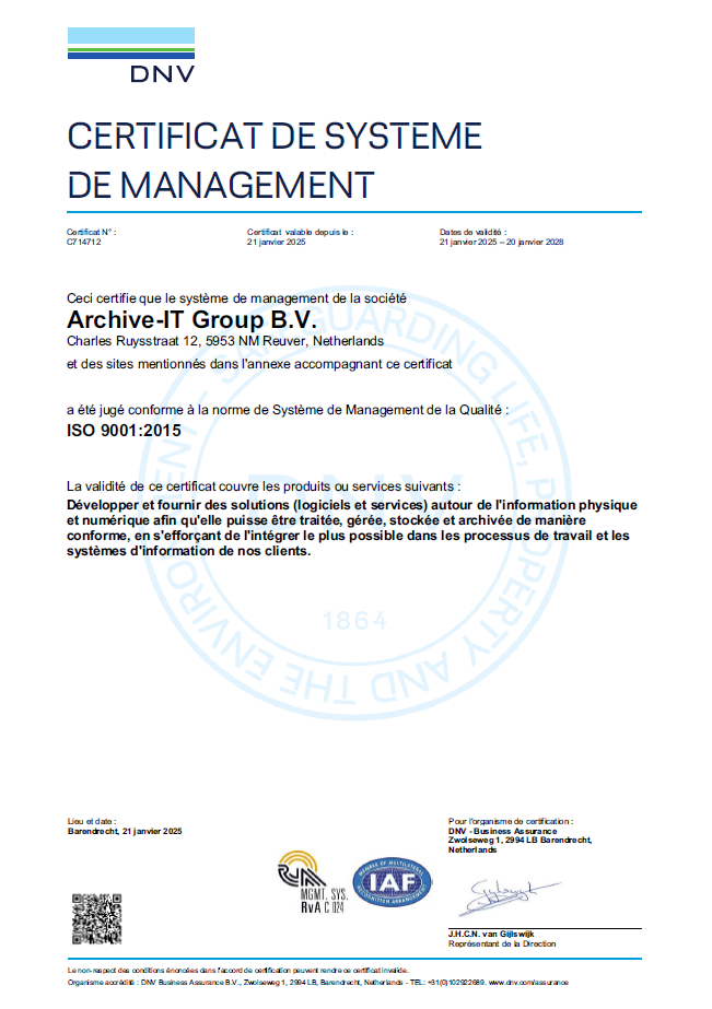 Nous nous efforçons constamment de maintenir les processus à un niveau élevé. Les certificats ISO confirment qu’Archivage-IT respecte la législation et la réglementation, que nous améliorons continuellement nos processus et que nous respectons les exigences internationales en matière de gestion de la qualité et de sécurité des informations.